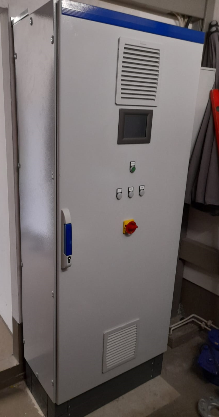 Lieferung und Programmierung eines Schaltschrankes für die Kaltwasserregelung und Kälteversorgung in einem Büro- und Geschäftshaus.